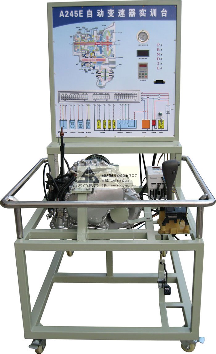 本變速器實訓臺是本公司采用一汽豐田自花冠動變速器為適應汽車教學需求而研制的,該實訓臺由電控變速器(八成新)、操作顯示面板及發(fā)動機彩色電氣原理圖電腦控制柜、可移動式臺架(萬向腳輪)、驅(qū)動系統(tǒng)(腳踏式油門踏板)變頻電機驅(qū)動、剎車系統(tǒng)(腳踏液壓盤試剎車)、啟動系統(tǒng)(電門鎖方式啟動)、車速傳感器、電磁閥執(zhí)行器、原車電腦、具有發(fā)動機運轉(zhuǎn)及顯示(轉(zhuǎn)速.車速.檔位)、液壓油壓力顯示表(顯示換檔過程油壓)、自動變速器電磁閥工作指示LED燈、原車OBD-Ⅱ診斷座、故障設(shè)置區(qū)可設(shè)置12路故障(老師設(shè)置任一路線路故障)、故障排除區(qū)(學生通過各種儀器、儀表、)在面板上用專用排故線連接排除故障、傳感器信號模擬等多項功能、具結(jié)構(gòu)緊湊、操作方便、安全可靠、教學直觀、是汽車自動變速器實物教學不可缺少的實驗室設(shè)備之一。